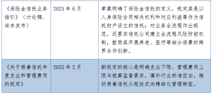 2025年行业自律规范正在加速出台。据不完全统计,2025年以信托业协会为主导的自律规范已经出台有《绿色信托指引》、《信托文化建设指引》、《信托行业ESG披露指南》等3部,而正在讨论编制/征求意见的自律规范有《保险金信托业务指引》、《家族信托业务指引》、《资产管理信托产品估值指引》等多部核心自律规范。协会主导的自律规范与“新三分类”“资管新规”等政策无缝对接,形成“顶层政策+监管细则+自律指引”的三级制度体系。
